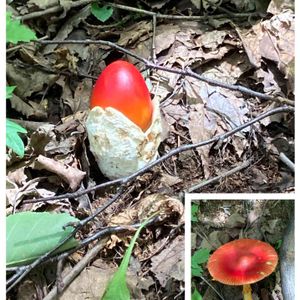 タマゴタケ 初めて見た❣️ ひと月前にはギンリョウソウを沢山見つけた場所 実は食べられるが 外見の特徴が毒キノコのベニテングタケヤマタマゴモドキに似てる😵