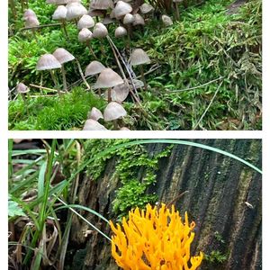 キノコの山(コケむした岩にキノコ) ニカワホウキタケ 一瞬カエンタケ!イヤ オレンジ色 細い ちょっとビックリしました