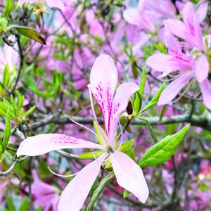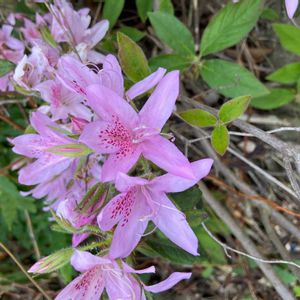 モチツツジ(黐躑躅)ツツジ科ツツジ属 山の公園にモチツツジが咲き始めました。 お花の根元をさわるとベトベト。 マクロで撮ってみました。 腺毛が凄いです。 これがベタベタするんですね。 モチツツジは、低山や丘陵地に自生します。 高さ1~2m程度です。 花は5月頃に咲き、薄紫色の花弁が特徴で、花柄や葉には粘着性のある腺毛が密生しています。この粘着性から「モチツツジ」という名前が付けられました。 本州(静岡県・山梨県~岡山県)と四国に分布。 🏷 木曜日は桃色 🏷 木曜日は木