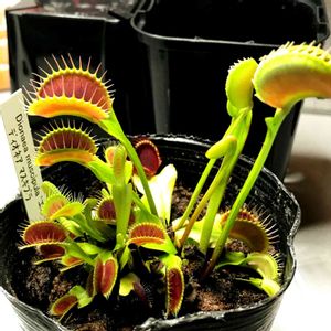我が家の寄せ植えの中にある品種不明のハエトリソウ。 特徴が ◎感覚毛が多数出る ◎ロゼットタイプ ◎4センチ以上の捕虫葉 ◎内側が真っ赤に色付く わかる方がいれば品種名を教えて下さい。
