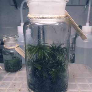 ホウオウゴケの苔テラリウム。理科実験室にて使い古された試薬瓶に植えました。