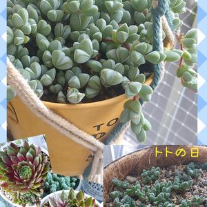 トトの日に参加しますє(・Θ・。)э››~♬ モリモリなトトさんは何ヶ所か黄色っぽい葉っぱがあるけど何故かなぁ🤔鉢が狭くなったかなぁ〜🤔 右下、✂️したトトさんを挿したけど、成長ぼちぼちですε( ε ˙³˙)з.。oO 左下、センペルのトレーシースーちゃん、お花みたいで可愛いわ💓