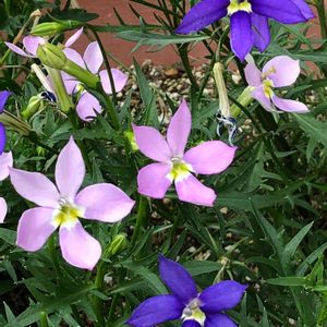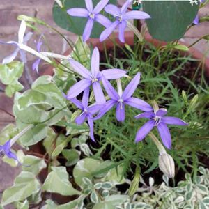 イソトマ💜 去年末、妹が見切り品の苗をたくさん買ったから…と持ってきました。確か10円か20円だった気がします😳❣️ 少し前から咲き出しました 水に濡れた薄紫色のお花、爽やかで涼しげです✨✨