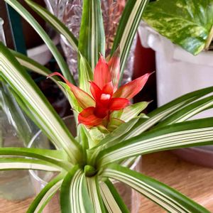 グズマニア 鮮やかなお花と班入りの葉にひとめぼれ😍 ソクお迎えしました 水耕栽培💧 しっかり芽が出たら土に植えるぞ😉