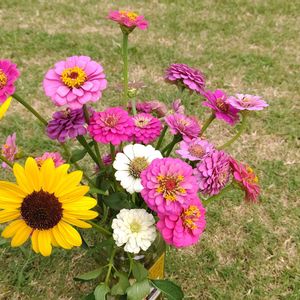 こんにちは👋😃 今日リビングに飾る花は、こちら👋🏻 ジニアと向日葵です🎵 あっ、毎日このセット😅 伸び過ぎた花をカットして、飾っています❗️