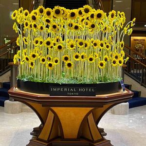 ひまわりのお花たちが一斉にこちらを向いて、お客さまをお迎えしています✨🌻🌻🌻🌻🌻 高さの違うひまわりのお花がきれいにアレンジされています✨ 元気いっぱいのパワーが届きますように✨🌻 北海道北竜町のひまわり畑を思い出しました✨( ◠‿◠ )🎶 ウクライナにも🇺🇦また平和にひまわりのお花が咲きますように🌻 こちらはホテルのロビー装花です✨ 第一園芸さんが、朝夕のメンテナンスも欠かさず丁寧にされているそうです✨ ひまわり レザーファン