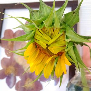 庭のひまわり🌻 もう少しで咲く❗というところで、根本からポキッと折れていました😭風のせいかな?? 咲くといいんだけどな🌻 奥の額縁は、クリスマスローズのドライフラワーです🥀