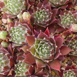可愛い王冠型😽👑 センペルビウム・ジョルジェットさん😻❤️🤍💚 一昨年の子株ちゃん達を植えたプランターで お孫ちゃんも産まれてます😸❇️