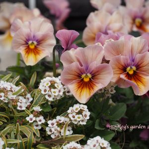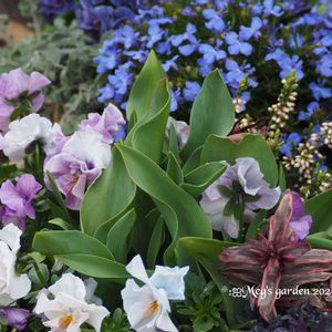 ヌーヴェルヴァーグ ラピスラズリさんと溢れ種アリッサム、斑入りセリフラミンゴの寄せ植えです¨̮♡ ラピスラズリさんの花数が増えてきました🥰