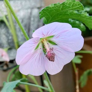アニソンドンティア 別名 サクラアオイ(桜葵) 花友から分けてもらった小さな挿し芽が40cmほどに伸びて、可愛いお花が咲きました💠 公園などでは大きな木に咲いているのは見たことがありますが、こんなに小さな木でも咲くのですね🤗 でもベランダの鉢植えなので、これ以上は大きくならないで欲しいのですが···😅💦