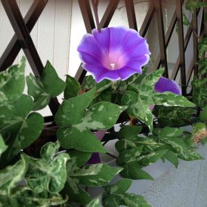 朝顔 今年は、コレの牡丹が出ませんでしたが、綺麗な形だったので。 黄斑入握爪龍葉黒鳩覆輪獅子咲 しばらくは咲きそうです。