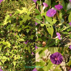 「朝顔さんたち」 朝から晴れ☀️出した。今日曇り☁️の予報?だったかも…。と、庭に出て、驚き👀‼️ モッコクに絡み付いて咲いていた青い💙朝顔さんたちが、紫色💜に変身して咲いていました😃朝夕の気温差が激しくなってきたこの時期に、なんてたくましいのでしょうか!