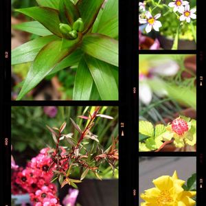 ↖️別鉢のスカシユリ(赤) ギョリュウバイ ↗️ニワゼキショウも、 ヘビイチゴも(果実)👈🏻いつの間にか増えてます(•ᴗ•; ) 何色だったか忘れてた ミニバラの挿し木鉢が数鉢 ツボミがあがってきて 咲いたら皆んな黄色だったょ…