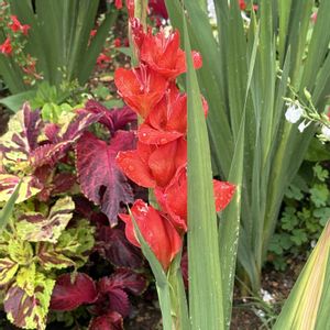今日のお花 グラジオラス スッと伸びた花穂と葉 鮮やかな色は夏の花壇を彩ります 2025.7撮影
