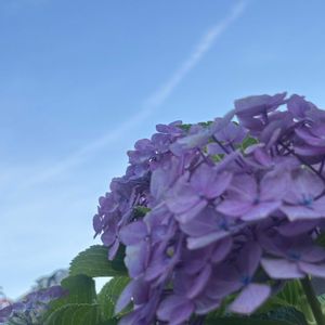 梅雨☂️は、いったい 何処へ⁈ アジサイと飛行機✈️ と ひこうき雲 伊丹空港を飛び立ったばかりの 飛行機✈️ 何処へ、、、?!