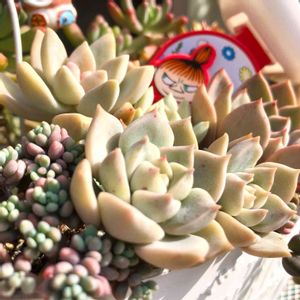 毎月16日はトトロの日🏷 KEIKOさんに頂いた多肉ちゃん達と我家の子達を少々織り混ぜて作った寄植え🍀 真ん中に少しスペースができたので乙女心ちゃんを入れてみました❤️