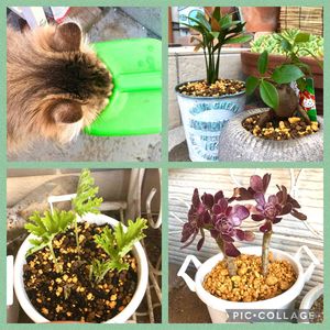 9日は黒法師の日🏷 最近天気予報がコロコロ変わります(´`:) 雨が降る予報なのに☀️めっちゃ晴れたり 今日から火曜日まで☀️予報で痺れを切らしてお水あげたら、深夜に☔️マーク😩 このパターン何度目かしら?(ρ_;) ベランダの多肉達にお水あげようと準備してたらアオちゃん🐈がジョウロに顔を突っ込んでお水飲んでました(*´ω`*)💕 右上は、旦那さんがトイレに植物置きたいとDAISOの300円の観葉植物を置いてましたが枯れてきたのでお外に出してた物と、娘が買ってきたガジュマル🍀 娘が鉢を買ってきて「植え替えたいから土を作って❣️」と言ってきたので娘と2人で植替えをしました❤️ 旦那さんの買ってきた観葉植物は買った時のままだったので、娘のガジュマルと一緒に話をしながらの植替えは楽しかったです (o´ω`)💕 下の写真はカレンソウと黒法師🍀 親株から✂️カットして切り口を乾かし植えといて1か月位の物🍀 今のところ順調そうです✨ 黒法師はもう少し育てたら実家にお裾分けしようかと思ってます(o´ω`)