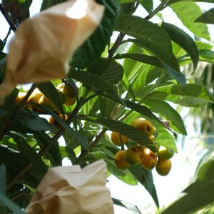 びわ‼️ びわ‼️ びわ‼️ 段々黄色く色付いて来ました。 🤗🤗🤗🤗 袋掛けしてる方は、カラス対策。 もう少しで食べられそう。
