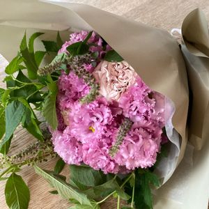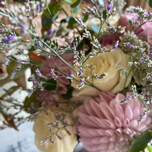 今月のブーケレッスン💐 花材 リシアンサス(ジュリアスラベンダー) バラ(ウエストミンスターアミー) 山ごぼう 木いちごベビーハンズ アフリカンスローバジル 丸く、山型にしようとしてると、段差がガタガタに💦 山ごぼうの自由な曲がり方に手こずりながら、なんとか形になりました💮 バジルの香りがたまらず、昼ごはんに冷凍ピザを🍕衝動買い😝 楽しい時間をありがとうございました