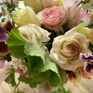 今年の1月から ブーケレッスン始めました💐 こちらのブーケは4月のお花たちです 沢山の可愛い春のお花たちに癒されながら束ねました♥️