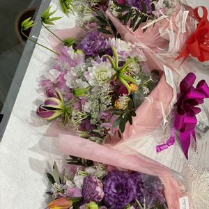 こんにちは😃 昨日はブーケレッスンの日でした💐 グロリオサ、ダリア、トルコキキヨウ、チューリップ、レースフラワー、スイートピー、シレネ、オリーブ、8種類の花を使いました。それぞれ個性が出ますね♪素敵に仕上がり喜んで貰えた様です🥰 午後も無理せずボチボチ頑張りましょうね🙋🏻♀️💕🎶