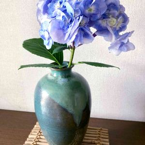 茶花用の花器と紫陽花。 「花は野にあるように」(千利休) なるほど…🤔この花器には一輪がいいようです。