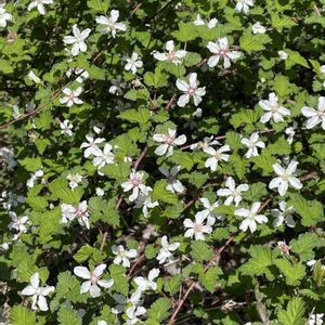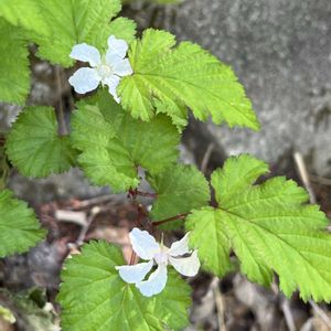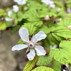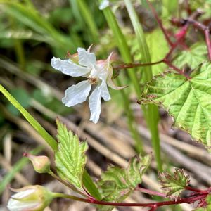 ニガイチゴ(苦苺) バラ科 キイチゴ属 4~5月 50~100cm 在来種(日本固有種) 落葉低木 茎や枝は粉白色を帯び、細い刺がある 葉は互生し、長さ6~10㎝の広卵形 葉裏は粉白色 葉は3裂するが、切れ込みに変化が多く、深く3裂する場合や切れ込みが全くない場合がある 葉縁は細かい鋸歯がある 花のつく枝の葉は切れ込みがほとんどないことも多く、長さ2~5㎝、先が円頭~鈍頭になることが多い 葉柄は赤色を帯び、刺がある 花径2~2.5cm 白色の5弁花で花弁の幅が狭い 短枝の先に1(~2)個、上向きに咲く 果実(集合果)は直径約1cmの球形で赤く熟す 果肉は甘いけれど、種を噛むと苦みがあるのだそうです😊