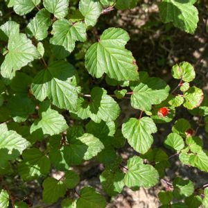 ニガイチゴの花後ですね、もうしばらくしたら美味しい黄色いキイチゴをたわわに実らせてくれるでしょう😍 この個体の葉っぱはかなり丸くて卵形ですね、結構変化が大きくて、もっと尖った3裂する葉っぱがデフォかな⋯🌿