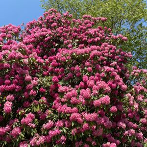 シャクナゲ(石楠花) 3月23日に訪れた時は蕾だったので、もう咲いたかな?と楽しみに行ってみました。 大きな木全体にピンクのお花が満開です。 花言葉に、「威厳」「荘厳」とありますがまさしくその通りの姿でした。 後ろに見える大木はコウヨウザンの緑色です。 青空と優しい風にそよぐ新緑がとても気持ち良く、心の優しさチャージができました。 ひとりで行く植物園は、いろんな植物やお花や虫たち、今日はメダカもお話相手になってくれます。なんだかクセになりそうですよ〜😊🎶🎶🎶
