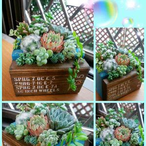 ちーさんのウッドプランター💞 早速、寄せ植えしました(≧∇≦)b 嬉しくて昨日からアレコレ妄想、構想がいっぱい……途中、バランス悪くて悩みましたが、なんとか出来上がり~✨ なんちゅー爪❤企画なので、やはりセンターは爪美人💅 原種ザラゴーサ🌼 Rundeli×Laui🌼 ダイソー産サボテン🌵 フワフワサボちゃん🌼マミラリア白星 エコフェスタのサボテン 銀手まり🌼 自分で言うのもなんですが~想像以上に可愛くできました~(笑)自画自賛(//∇//)💕 ちーさんのウッドプランターが素敵だから~👍👍 楽しい寄せ植えができました(*^^*) ありがとうございます🍀