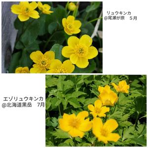 5月尾瀬ヶ原で出会ったリュウキンカと7月北海道大雪山系の黒岳登山道で出会ったエゾリュウキンカ