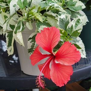 ( *ˊᗜˋ)ノこんにちゎ〜ꕤ*. ・ 🌺 ハイビスカス 🌺 🌿🌿🌿も綺麗なハイビスカスさん おうちに来て ヤット咲いてくれました🌺 午後も Häppÿ に 過ごせますように🍀*゜ ・