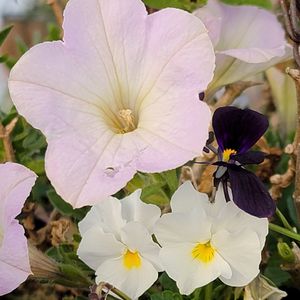 おはようございます (*ˊᵕˋ*ค⁾⁾✲゚︎* 🌸 ペチュニア & ビオラ 🌸 頑張って咲いてくれている ペチュニアさんの ハンキングに こぼれ種 ?の ビオラさん 可愛いく 咲いています 🤍💜 今日も( *ˊᗜˋ)ノꕤ*.゚・• ᶠ ⁱ ᴳ ʰ ᵀ ᵎᵎ 𖤐˒˒Շ”ਭꔛ*゚ʾ ・