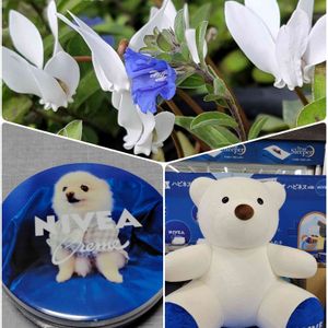 ( *ˊᗜˋ)ノこんにちゎ〜ꕤ*. 🌸アメリカンブルー& ヘデリフォリウム 🌸 原種シクラメンさん 真っ白で 綺麗です 🤍 今日は テディベアズ・デ― なので ニベア🐻🤍💙も おまけで クルミ🐾も 先日 サービスで オリジナル缶を 作って頂きました ´•ﻌ•`🐾 でも 撮られのが好きでないので イマイチですね ( ´•ᴗ•ก )💦 🤍💙の組合せって いいですね 💕 午後もガンバです♡o(´∀`o*) ・