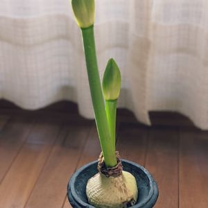 マジックアマリリス、4月のフラワー&ガーデンショーで購入した、水も土もいらないアマリリス^ ^ 一回棚から落下して茎折れるというアクシデントに見舞われながらも、無事2本目が生育中^ ^