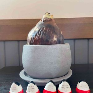 マジックアマリリス タブレット お水も土も肥料もいらないというマジックアマリリス。 会津の起き上がり小法師と共に。✨