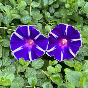 昨日も投稿した支柱から脱走中の朝顔 富士の紫 コンボルさんの葉っぱの波に乗ってふたつ並んで咲きました🤭 ニコニコ( *´꒳`* )( *´꒳`* )嬉しそう