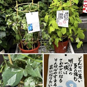 朝顔が欲しい!と母からのミッションで娘とテクテク探しに行きました(笑) 今年は苗もあまり見かけず 心当たりは、いつも利用のとは別の少し離れたスーパー内のお花屋さん 店前に並んでいるので外気にも慣れているはず 行灯仕立ての「団十郎」と「江戸の朝空」 団十郎は去年?一昨年?に育てたのと、蔓の成長は良いのですが蕾が見当たらないので咲くまでかかりそう 江戸の朝空は葉っぱは少ないですが小さな蕾は沢山見えていて、何より斑入りの葉っぱ😚 大きめの青い花が咲くならとこちらに決めました お店の人は団十郎の方を押していて、実はそっちの方がお高いんだよと(笑) それでも江戸の朝空にしたら値引きしてくれました🤣 素敵なタグも付いていました😊