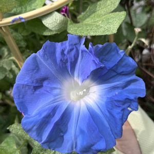 🤣青かった(笑) 江戸の朝空で間違いないようです ひとつ前の投稿で蕾の赤さに動揺しまくりましたが💦良かった〜🎶 赤い色素があるとこういう事ってあったなーと今更ながら思い出す🤭 朝早くには淡い色だったそうです(私が見た7時半頃にはこの色に💦) 調べてみると江戸の朝空は淡い色から濃くなる様です 咲いた位置が悪くて枠に当たりお花がクシャっとしてしまいました😂