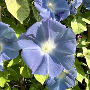 朝顔 江戸の朝空 ✨️ 蔓もだいぶ伸びて今朝はたくさん咲きました☺️ この色お気に入り💙 葉も斑入りで爽やか〜 熱が続いた風邪もだいぶ落ち着いてどうにか動けるようになりました カロナールが効かなかった😓