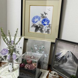 もしも存命なら111歳になった祖母の絵🤭 青の朝顔の入った額が開かなくなり入れ替えられずに毎年この時期に出して飾っています 薄紫の朝顔 サギソウ 富士山も祖母の絵