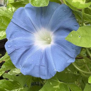 朝顔 江戸の朝空 今年のひとつ目の花が咲きました 色はいい感じ(๑•̀ㅂ•́)و💙 天候悪くて朝すでにクタクタ😂残念〜
