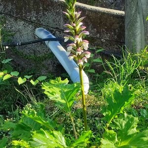 立派な葉と花を写したら、管の方が目立ちました。 主役は咲いてきたアカンサスモリス