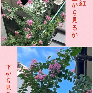 我が家の百日紅🌸 いつもより咲いてくれています🌸 洗濯物を干しながら ベランダからの眺めと お水をまきながら 小さなお庭からの眺めと 伸びた百日紅の枝の先端は お隣さんにもお邪魔して₍₍ο(*⸝⸝˃ ᵕ ˂⸝⸝*)ο₎₎ 我が家のシンボルツリーかな(ฅ♡∇♡ฅ๑)~ιονε♡
