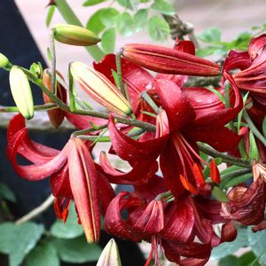 シャンデリアリリー レッドベルベット 一週間くらい前の様子です。 赤黒い花びらとおしべの色が似ていて、可憐というよりは、落ち着いたカッコいい雰囲気の百合です😊