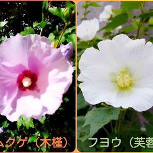 お待たせしました‼️😄 💯 前投稿(8/28)の答えでーす‼️🐶 ⬅️ 木槿(ムクゲ)6月末〜10月開花 ➡️ 芙蓉(フヨウ)7月末〜10月開花 ムクゲの方は梅雨の頃から咲きますが、 フヨウは梅雨明け。お花はそっくりです。 花の色ではわかりません。😅 ムクゲの葉っぱは小さめの鋸歯、フヨウの葉っぱは大きめで、手のひらみたいです。🤗 (♥️ 葉っぱで区別できまーす。😉) ムクゲは上に成長するけど、フヨウはけっこう横に広がります。 雄しべの形も微妙に違いますよ。😅 ありがとうございました。🐶✌️ (人気の投稿にのりました。😉 9/3 頃。 ありがとうございます‼️😅)