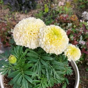 マリーゴールド ホワイトゴールドミニ🌼 ホワイト系アフリカンでは初のコンパクトタイプ!らしい😆✨ とはいえお花は大きく、花と花がぶつかってむぎゅーっとなっています😂かわいい💕