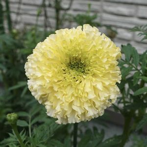 咲き進み、まん丸になったマリーゴールド ホワイトスワンです🟡 夏に元気に咲いてくれるお花はいいですね♪元気をもらえます💪 マリーゴールドだよねと何も考えず花壇前方に植えて、高さが100cm超えの品種だったのは私の確認不足でした😅