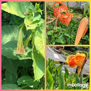 ◉エンジェルストラン ペット ナス科 和名 キダチチョウセン アサガオ 花色 白、ピンク、黄 オレンジ 大きなラッパ状の花が ぶら下がるように開花 ◉カンナ カンナ科 花色 白、赤、ピンク オレンジ、黄、複色 炎天下 鮮やかな花が 目を引きます ◉オニユリ ユリ科 原種のユリのひとつです オレンジ色の花に斑点が あり、花弁は反り返った ような形をしています ②枚目 ◉カラスウリ(花) ウリ科 つる性 花は日没とともに咲き 出し、翌朝には萎みます 白いレースのような繊細 な姿です ◉そろそろ カラスウリの 花が見れるかもと近所を 散策しました 発見はしましたが 高所で少し距離もあり 雨も降ってきたので断念 開いたら綺麗です❣️