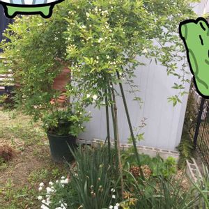 白モッコウバラ まだまだ幹がわりに育てている枝が細いですが、スタンダードに近づいてきました。 今年も花芽がついてくれました。 お隣さんが写らないように気をつけてますが中々加工が難しい(*≧∀≦*) 面倒くさいなってカエル貼り付けたった🐸